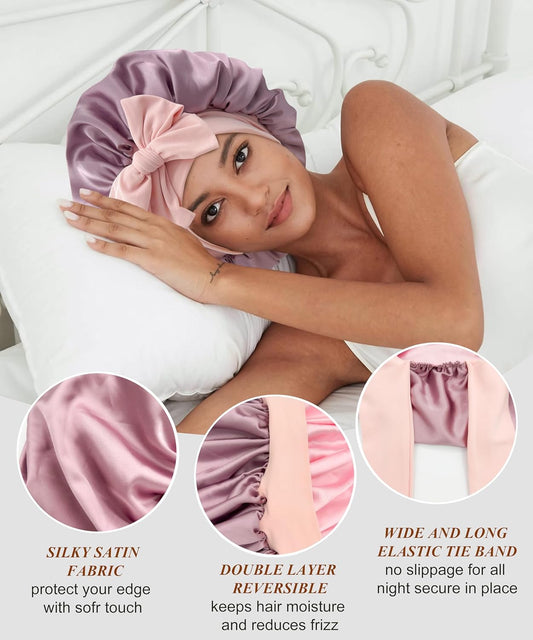 Reversible Double Layer Satin Hair Bonnet with Tie Band for Natural Hair (Includes Scrunchie)