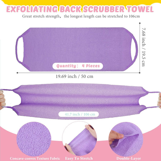 Exfoliating Back Scrubber with Handles | Set of 8 Shower Bath Gloves 4 Pairs Scrub Stretchable Pull Strap Washcloth | Pink, Purple, Blue, Green