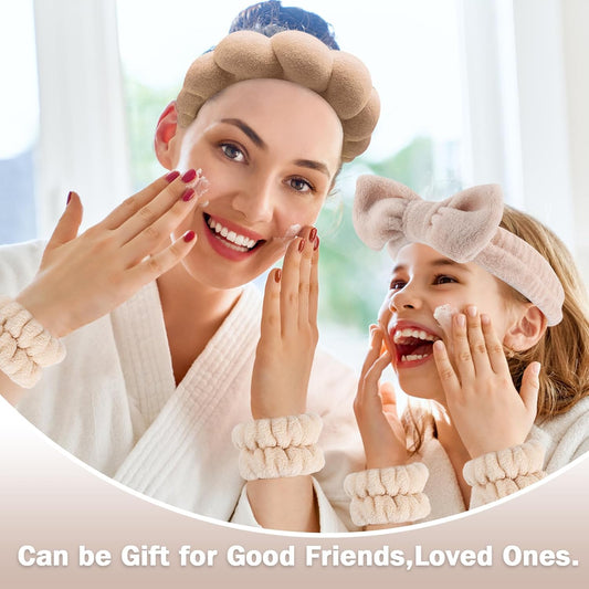 NO MORE DROPLETS 4Pcs Spa Headband for Washing Face | Wristbands Set Bubble Skincare Terry Cloth Padded, Puffy Headband, Bow Tie Hairband | Cute Non Slip Thick Hair Accessory